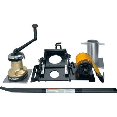 I acquired a Harken model 44 self tailing winch and bolted it to a thick aluminum plate with the idea that the aluminum plate could slide into a mounting bracket which would strap to a tree. The mount was cobbled together from steel plate and angles that we had lying around the shop.